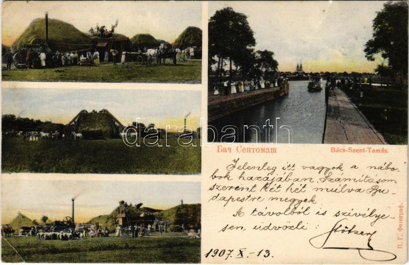 1907 Szenttamás, Bácsszenttamás, Srbobran; mezőgazdasági munkák, aratás, cséplőgép, kikötő / harvest, threshing machine, port (fa)