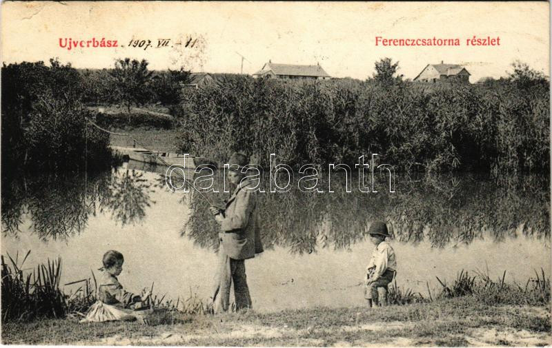 Description: 1907 Újverbász, Verbász, Novi Vrbas; Telecskai szőlők a Ferenc csatorna mentén, szőlőskertek, horgász. Kiadja Garamszegi Dezső 96. / vineyards along the canal, fisherman (EK)