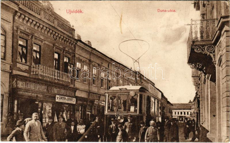 Description: Újvidék, Neusatz, Novi Sad; Duna utca villamossal, Gortán és Donáti üzlete, Singer J. udvari fényképész irodája és saját kiadása / street view with tram and shops (EK)