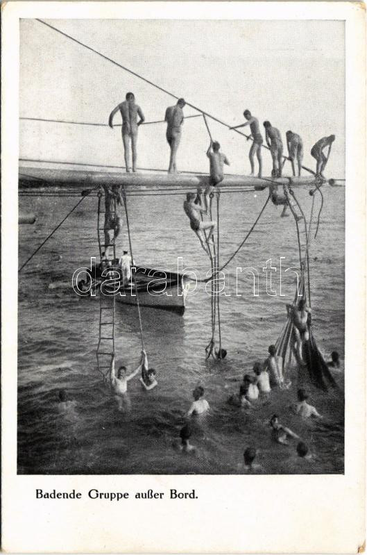 Description: K.u.K. Kriegsmarine. Badende Gruppe ausser Bord / Osztrák-magyar haditengerészet matrózai meztelen fürdőznek a tengerben / Austro-Hungarian Navy mariners bathing naked in the sea