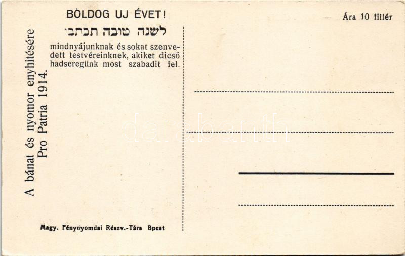 Description: Osztrák-magyar hadihajók a tengeren. Zsidó héber nyelvű újévi üdvözlet a hátoldalon. A bánat és nyomor enyhítésére pro patria 1914 / K.u.K. Kriegsmarine Kriegschiffe / WWI Austro-Hungarian Navy battleships at sea. Jewish Hebrew New Year greeting on the backside