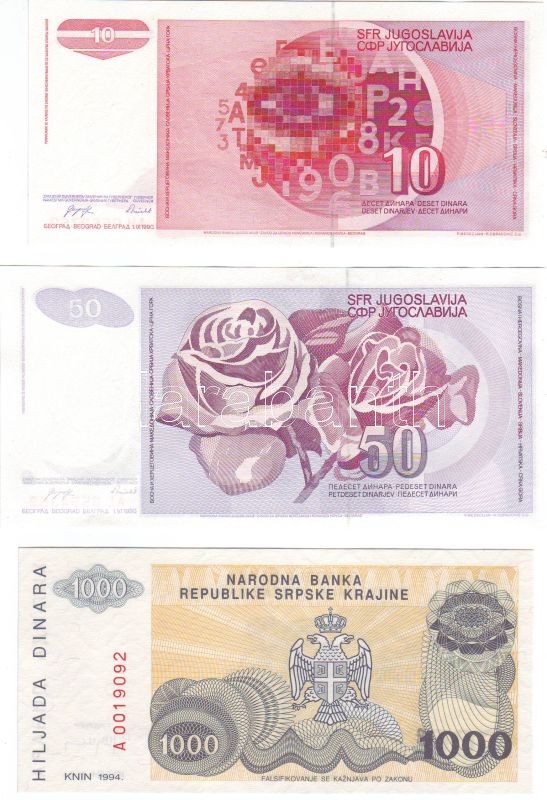 Jugoszlávia 1990. 10D, 50D, 500D, 1000D + Krajina Szerb Köztársaság 19...