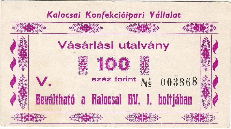 Kalocsai Konfekcióipari Vállalat vásárlási utalvány 100Ft (börtönpénz) modern T:II