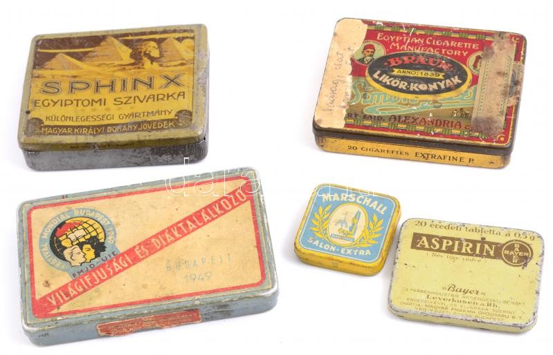 Festett fém reklámos dohányos, gyógyszeres, tűs dobozka. Aspirin, Marschell, Sphyinx szivarka, stb 5 db