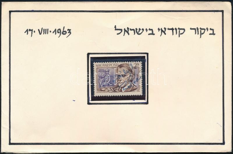 Kodály Zoltán (1882-1967) zeneszerző sajátkezű aláírása őt ábrázoló 2 Ft bélyegen, héber nyelvű felirattal ellátott lapon