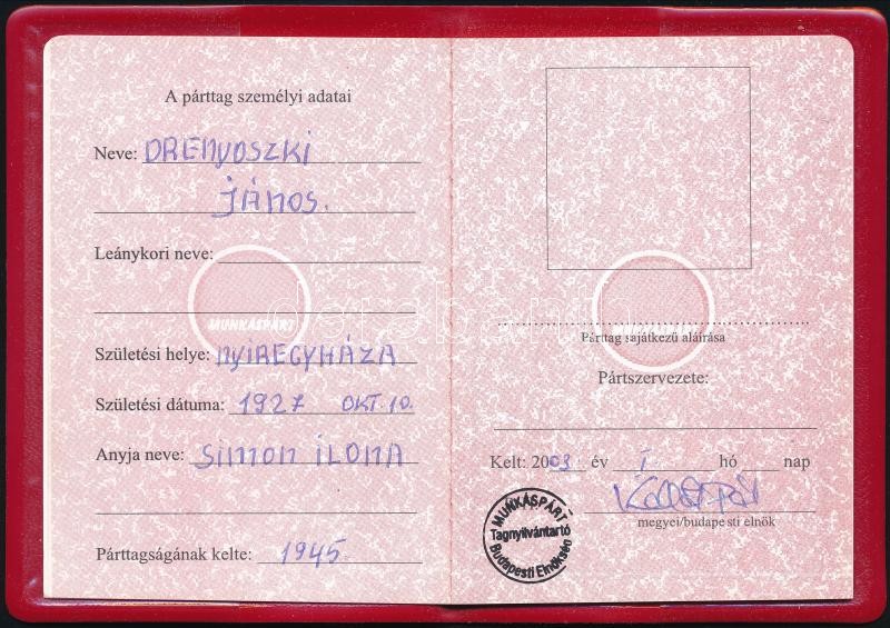 2003 Munkáspárt tagsági igazolvány