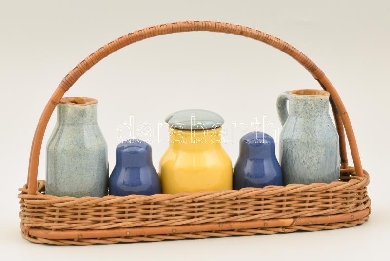 5 darabos kerámia fűszertartó készlet fonott kosárban, jó állapotban, ...