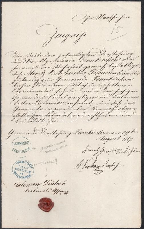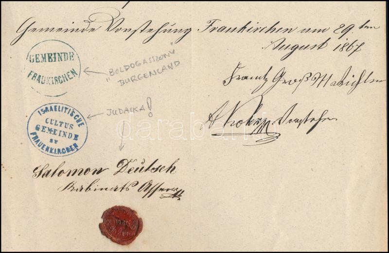 1867 Boldogasszony, Burgenland izraelita hitközségi judaika okmány alá...