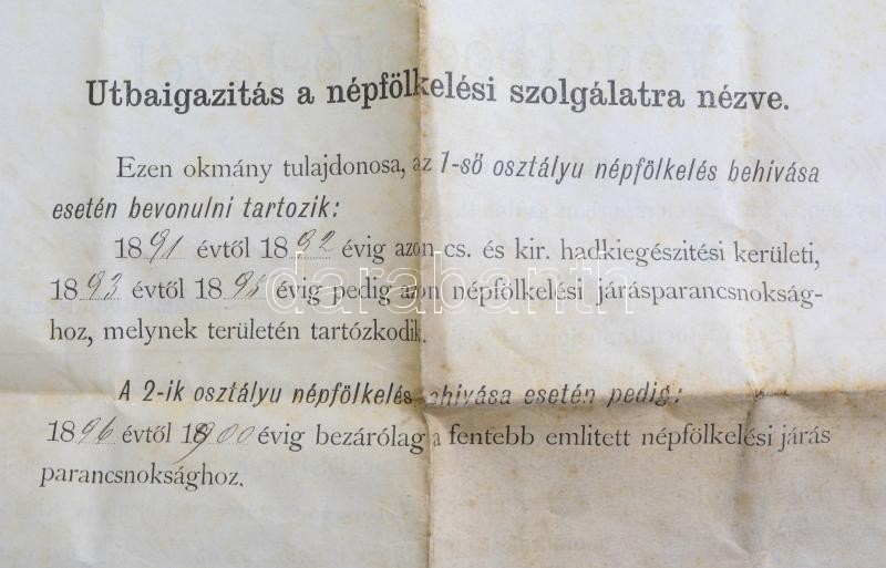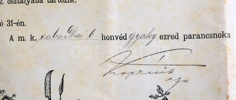 Description: 1890 Díszes, gazdagon illusztrált, címeres katonai végelbocsátó-levél a m. kir. szabadkai 6.-ik honvéd gyalogezredtől, ezrendparancsnok aláírásával, bélyegzővel. Kissé foltos. Lapon apró szakadásokkal és sérülésekkel. 41,5x53 cm