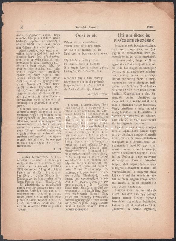 1918 Szatmári Honvéd. II. évf. 16. sz. 1918. szept. 20. A M. Kir. Szatmári 12-ik Honvéd Gyalogezred Ujságja, az első lap leszakadt, foltos, 12 p.