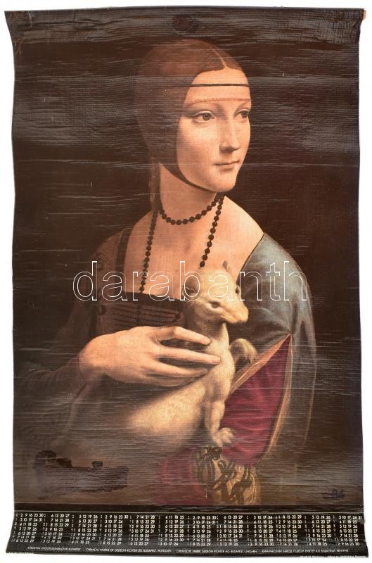 Description: 1984 Leonardo da Vinci: Hölgy hermelinnel c. festményének reprodukciója egy 1984-es naptáron, Bp., Kőbányai Gyógyszerárugyár, (Medicina-Offset-ny.), vászon, foltos, 75x48 cm