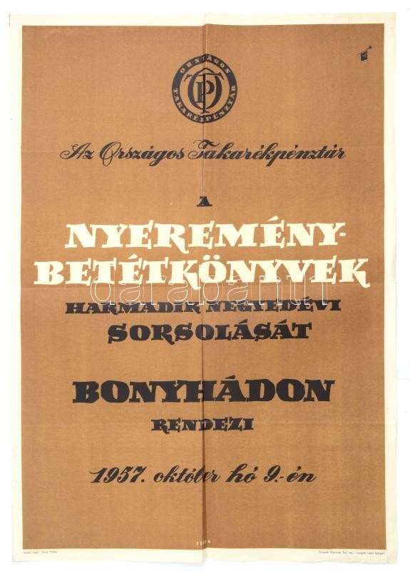 Fery Antal (1908-1994): Az OTP a nyeremények betétkönyve harmadik negy... https://www.darabanth.com/en/390-Online-auction/390.0/Art-and-other-collectibles/Posters~500034/Fery-Antal-1908-1994-Az-OTP-a-nyeremenyek-betetkonyve-harmadik-negyedevi-sorsolasat-Bonyha~II2352418