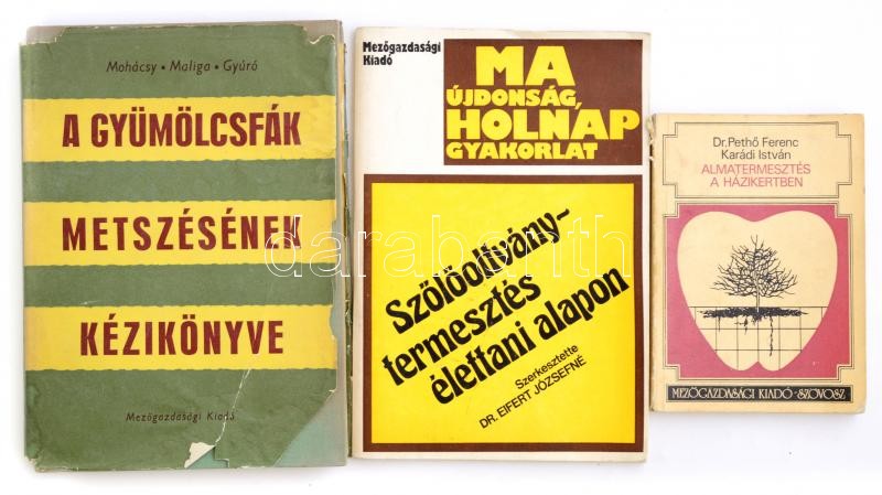 3 db kertészeti könyv: Dr. Mohácsy Mátyás, Dr. Maliga Pál, Dr. Gyúró Ferenc: A gyümölcsfák metszésének kézikönyve. Szerk.: Dr. Gyúró Ferenc. Bp., 1968, Mezőgazdasági kiadó. + Dr. Eifert Józsefné: Szőlőoltvány-termesztés élettani alapon. Bp., 1981, Mezőgazdasági kiadó. + Dr. Pethő Ferenc , Karádi István: Almatermesztés a házikertben. Bp., 1978, Mezőgazdasági kiadó.