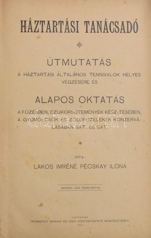 Description: Lakos Imréné Pécskay Ilona: Háztartási Tanácsadó. Útmutatás a háztartási általános tennivalók helyes végzésére. Nagybánya, 1903, Morvay és Undy. Borító nélkül.