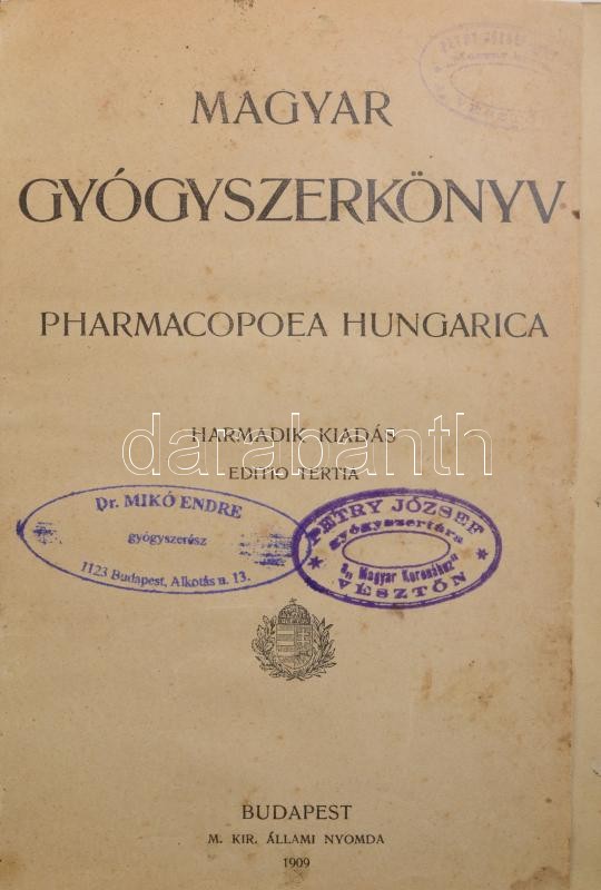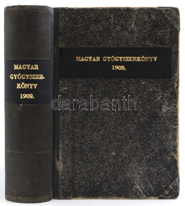 Magyar Gyógyszerkönyv. Pharmacopoea Hungarica. [Magyar és latin kötet egybekötve.] III. kiadás. Edito Tertia. Bp., 1909, M. Kir. Állami Nyomda, XX+414; 4+XIII+430 p. Magyar és latin nyelven. Átkötött kopott félvászon-kötés, aláhúzásokkal, bejelölésekkel, jegyzetekkel, névbélyegzőkkel, kissé foltos lapokkal, közte vésztői "Magyar Koronához" Petry József Gyógyszertára bélyegzéssel.