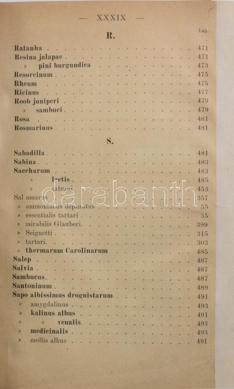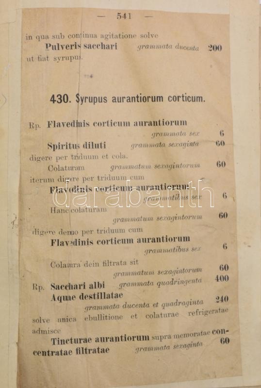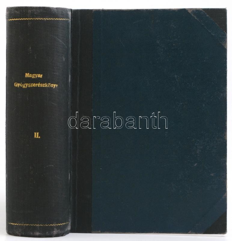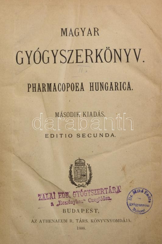 Magyar Gyógyszerkönyv. Pharmacopoea Hungarica. Második kiadás. Edtitio Secunda.; Függelék a magyar gyógyszerkönyv második kiadásához. Additamentum ad Edititonem Secundam Pharmakopoeae Hungaricae. Bp., 1888-1896, Athenaeum, XLV+51; 716 p. Magyar és latin nyelven. Átkötött félvászon-kötés, kopott borítóval, számos restaurált lappal, tulajdonosi névbélyegzőkkel, közte a ceglédi Zalai Ede Gyógyszertára a "Reményhez" bélyegzéssel.