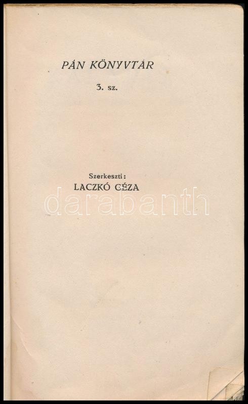 Bp., 1921, Pán. (Thália műint.). 81p. /Pán Könyvtár 3./ A sorozatnak 1921-ben összesen 5 kötete jelent meg 7-ig számozva (2 kötet dupla szám volt), majd megszűnt. Kiadói, szamárfüles papírkötésben