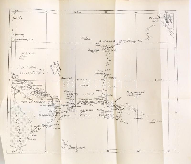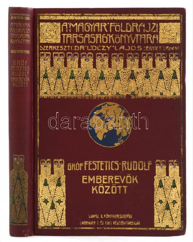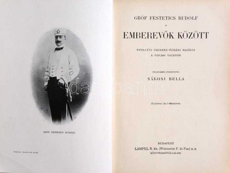 Festetics Rudolf (1865-1943): Emberevők között. Nyolcévi Csendes-óceáni hajózás a "Tolna" yachton. 55 képpel és 1 térképpel. Fordította: Sárosi Bella. Magyar Földrajzi Társaság Könyvtára. Bp., én.,Lampel R. (Wodianer F. és Fiai) Rt., 1 t.+4+278+1 p.+ 1 (kihajtható térkép) t. Az oldalszámozáson belül szövegközti és egészoldalas fekete-fehér fotókkal illusztrált. Kiadói aranyozott egészvászon kötés, kis kopásnyomokkal.