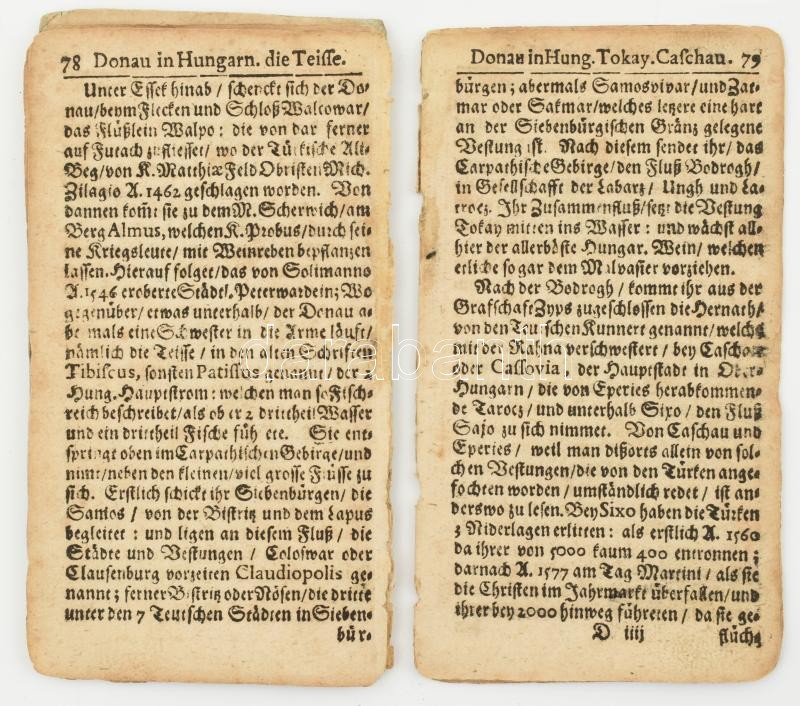 [Sigmund von Birken (1626-1681)]: Birken, Sigmund von: Der Donau-Strand mit Allen seinen Ein- und Zuflüssen / angelegenen Königreichen / Provinzen / Herrschafften und Städten / auch dererselben Alten und Neuen Nahmen / vom Ursprung bis zum Ausflusse: in Dreyfacher LandMappe vorgestellet, auch samt kurzer Verfassung einer Hungar- und Türkischen Chronik, und Des Anno 1663 und 1664 geführten Türken-Krieges, beschrieben durch - - ... Nürnberg, 1683, Jacob Sandrart, 1 sztl. lev.+ 11 sz. lev. (55/56., 57/58., 65/66., 77/78., 79/80.,81/82.,83/84.,85/86.,87/88.,89/90,91/92.) Német nyelven. Az előlső kötéstáblával, hiányos, szétvált lapokkal.