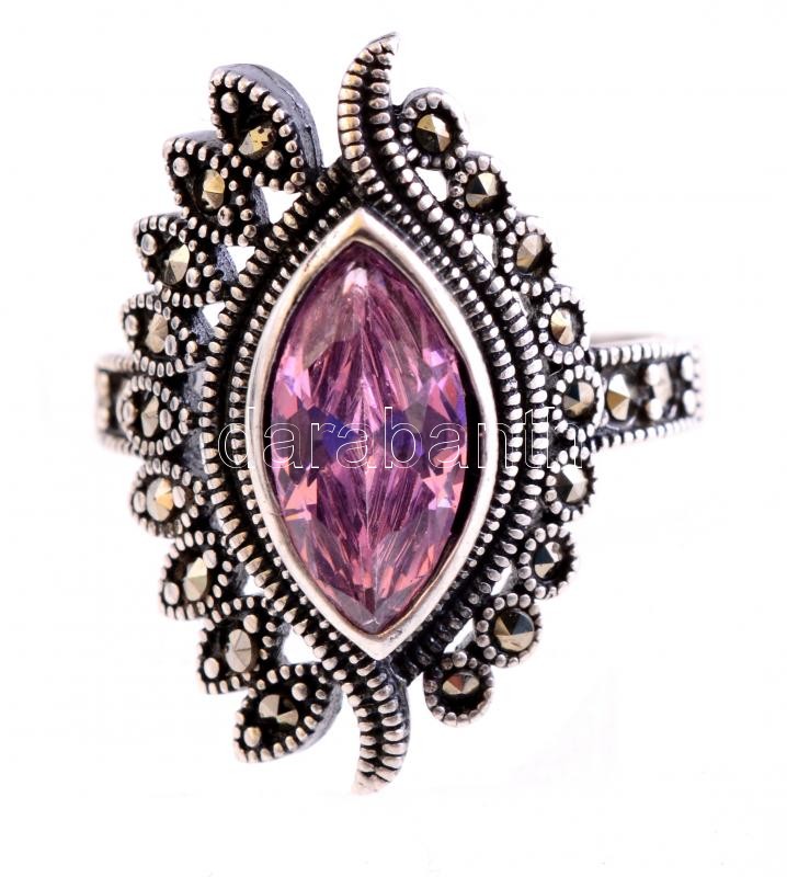 Ezüst(Ag) gyűrű, rózsaszín kővel, jelzett, méret: 55, bruttó: 5,2 g