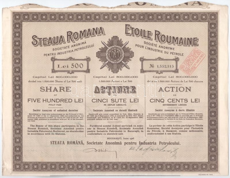 https://www.darabanth.com/en/390-Online-auction/390.0/Numismatics/Shares-and-Tickets~2000005/Romania-Bukarest-1926-Steaua-Romana-haromnyelvu-reszveny-500L-rol-szelvenyekkel-felul~II2345907