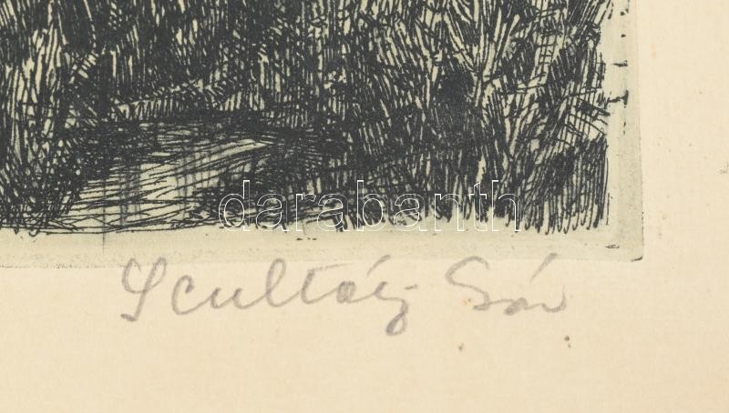 Scultéty Éva (1917-2001): Vízpart. Rézkarc, papír, jelzett, felcsavarva, lap alján kisebb folttal, 28×38 cm.