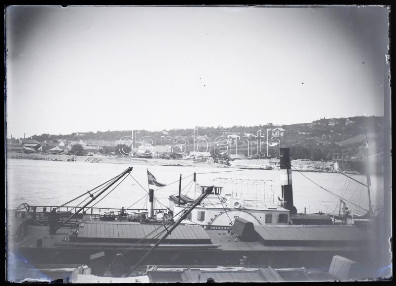 cca 1910 Azonosítatlan gőzhajó fotója, azonosítatlan zászlóval (Bajor címer?), feltehetőleg valahol Budapestnél, üvegnegatív, 13x18 cm