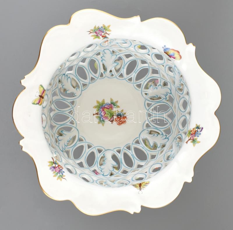 Herendi Viktória mintás nagy méretű, áttört asztalközép, kehely virágokkal gazdagon díszített. Kézzel festett, jelzett, hibátlan. d:30 cm, m:31 cm