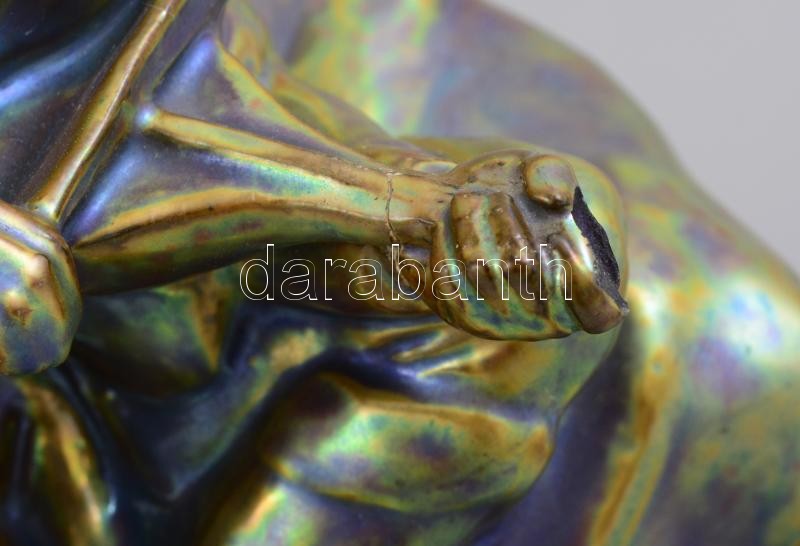 Zsolnay eozin mázas ülő hegedülő figura, jelzett (körpecsétes), sérült, hiányos, m: 22 cm