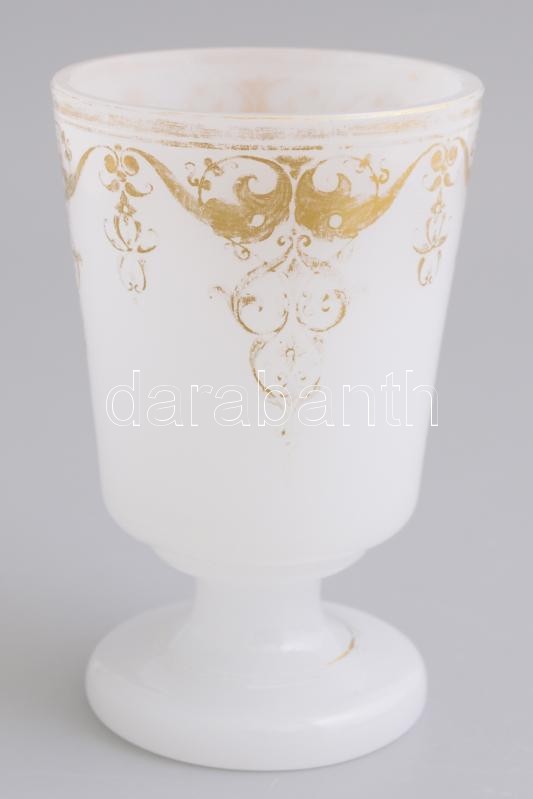 Antik fehér üveg pohár, arany színű kézzel festett historizáló ornamentikával, kopásnyomokkal, m: 12,5 cm, d: 8 cm