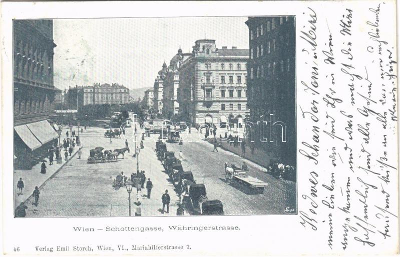 1900 Wien, Vienna, Bécs; Schottengasse, Währingerstrasse / street view, tram, horse-drawn carriages. Verlag Emil Storch 46.