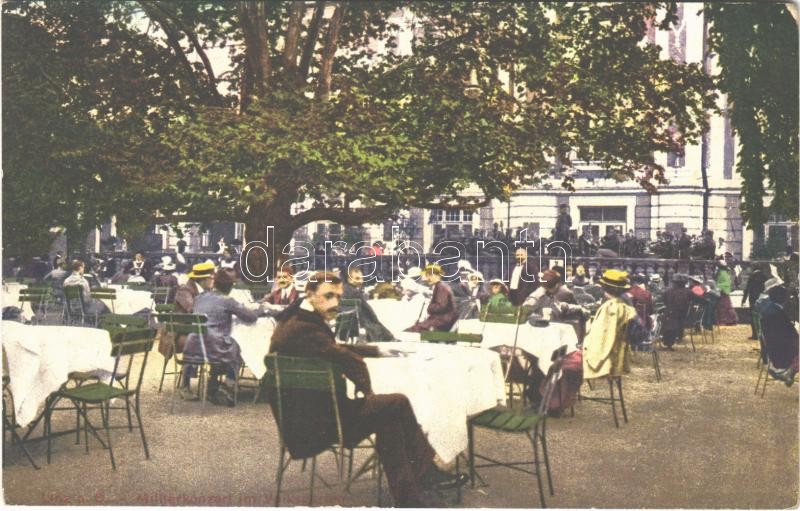 Linz, Militärkonzert im Volksgarten / K.u.K. military music band concert, restaurant, waiters, garden (Rb)