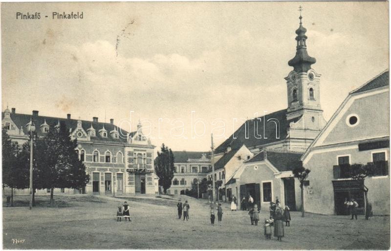 1918 Pinkafő, Pinkafeld; Platz, Kirche / tér, templom, Josef Polster ü...