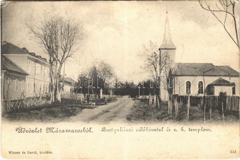 Description: Bustyaháza, Handalbustyaháza, Bushtyno, Bustyno, Bustino (Máramaros); erdőhivatal és római katolikus templom. Wizner és Dávid / forestry office, church (EK)