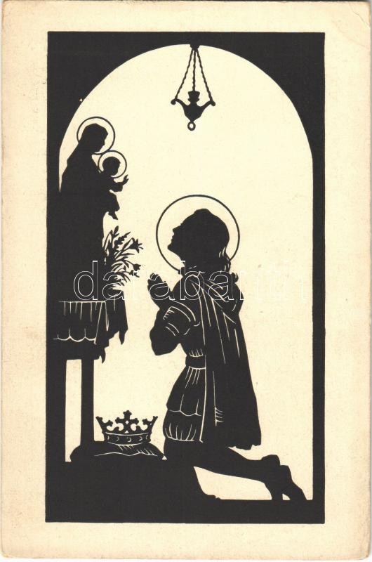 Description: Szent Imre fogadalma. "Pazmanita Tudósító" kiadása / Jungfräulichkeitsgelübde des heiligen Emmerich / Saint Emeric of Hungary, silhouette art postcard (EK)