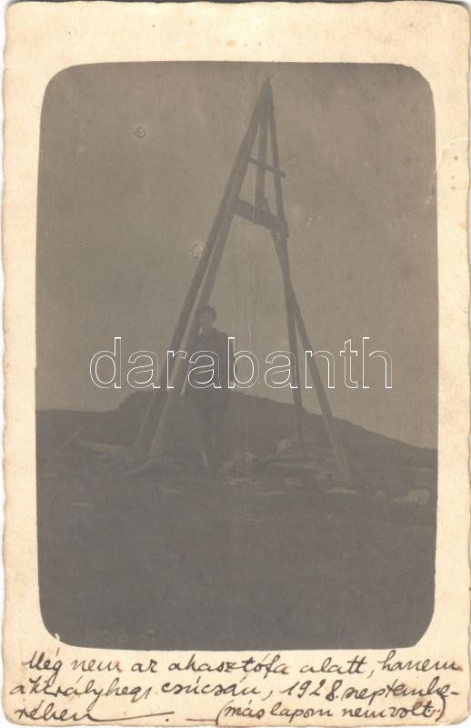 Description: 1928 Király-hegy, Királyhely, Králova hola (Alacsony-Tátra, Nízke Tatry); kiránduló a csúcson, "Még nem az akasztófa alatt" felirattal / hiker on the peak. photo (EK)