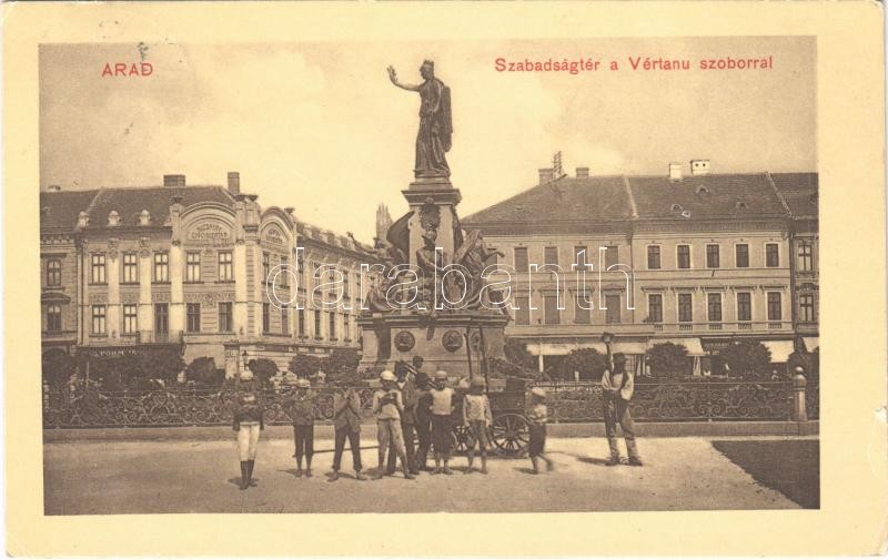 1911 Arad, Szabadság tér, Vértanú szobor, Rozsnyai gyógyszertár, kávéház, Seelinger M. Andor és Pohm János üzlete / square, statue, pharmacy, shops, café (EK)