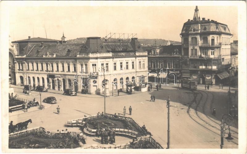1942 Nagyvárad, Oradea; Bémer tér, Magyar Általános Hitelbank nagyváradi fiókja, drogéria, villamos, katonák, üzletek / square, bank, drugstore, tram, soldiers, shops (fl)