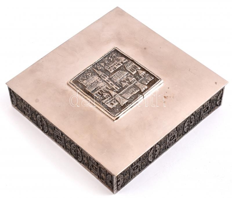 Iparművészeti fém doboz, Budapest plakettel. Jelzés nélkül, 16x16x3cm