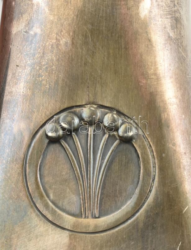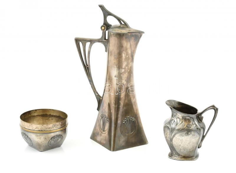 Description: Albert Kohler szecessziós kávés karaffa, tejkiöntő és cukordoboz fedő nélkül Fém, jelzett . / Jugendstil Albert Kohler marked carafe, milk jar and small cup: