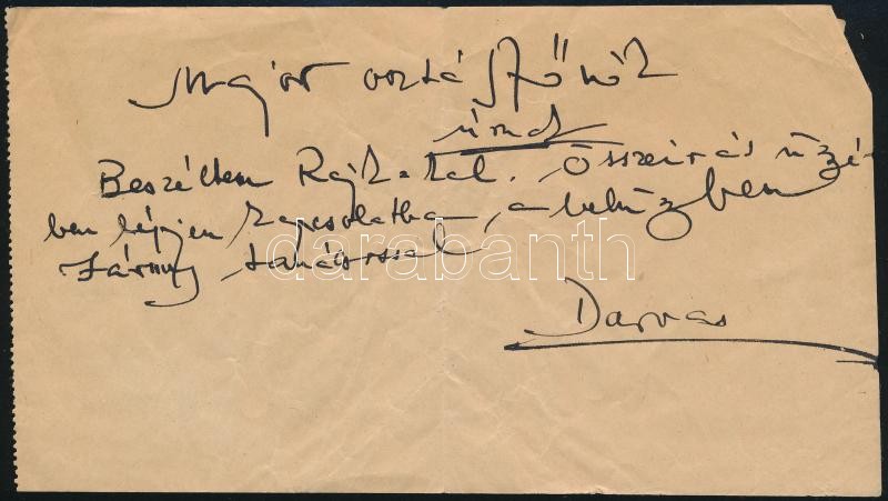 Darvas József (1912-1973) író, publicista, politikus autográf sorai Major Máté (1904-1986) Kossuth-díjas magyar építész, egyetemi tanárnak melyen Rajk Lázsló belügyminiszterről is szót ejt, hogy egyeztetett vele egy összeírás kapcsán és Jármy András BM osztályvezetőhöz irányítja.