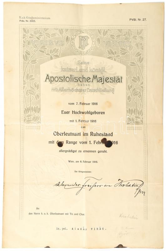 https://www.darabanth.com/en/391-Online-auction/391.0/Art-and-other-collectibles/Military~500035/1916-Nyugalmazott-fohadnagyi-kinevezes-Virag-Aladar-reszere-Krobatin-hadugyminiszter-alairC3~II2367652