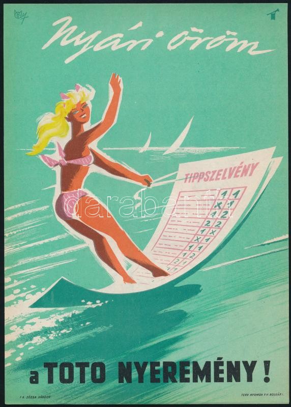 Macskássy János (1910-1993): Nyári öröm a TOTO nyeremény!, villamosplakát, jelzett, 23,5×16,5 cm