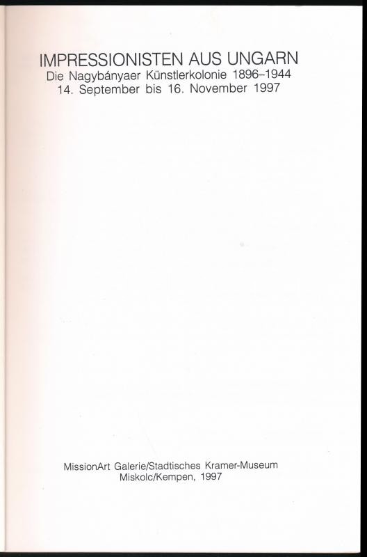 Simon Zsuzsa (szerk): Impressionisten aus Ungarn: Die Nagybányaer Künstlerkolonie 1896-1944. Miskolc/Kempen, 1997, MissionArt Galerie/ Städtisches Kramer Museum. 62p. Kiállítási katalógus német nyelvű előszóval , színes reprodukciókkal, többek közt Ziffer Sándor, Boromisza Tibor, Maticska Jenő, Thorma János, Tihanyi Lajos, Czigány Dezső, Perlrott Csaba Vilmos, Kádár Géza, Nagy Oszkár és Jándi Dávid képeivel gazdagon illusztrált. Kiadói papírkötés.