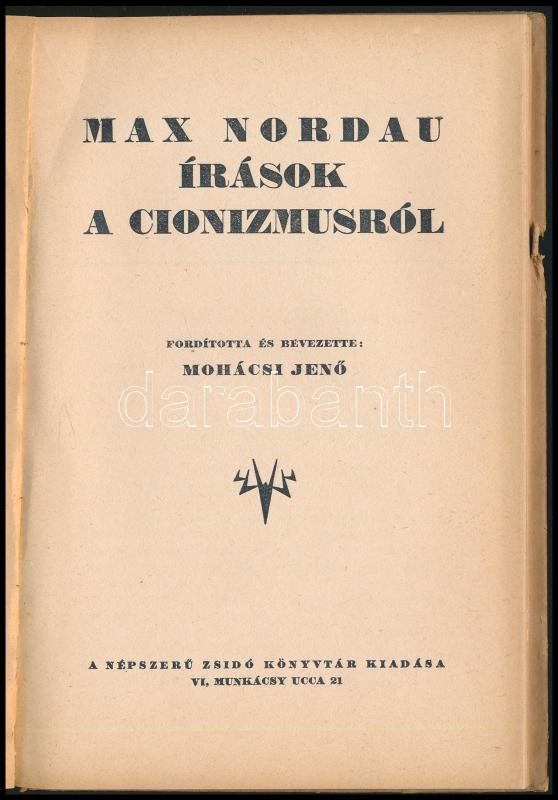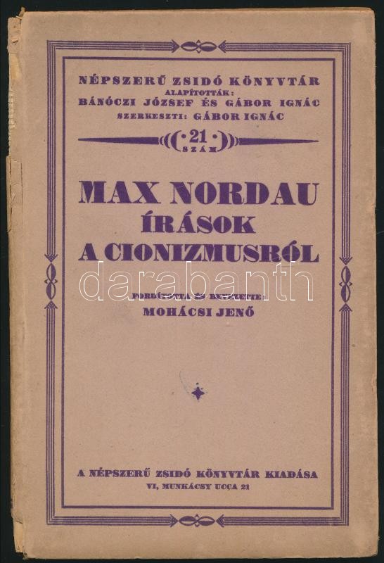 Max Nordau: Írások a cionizmusról. Ford. és bevezette: Mohácsi Jenő. Népszerű Zsidó Könyvtár 21. Szerk.: Bánóczi József és Gábor Ignác. [Bp.,1930,] Népszerű Zsidó Könyvtár,[Bíró Miklós-ny.], 52 p. Kiadói kartonált papírkötésben, sérült, hiányos gerinccel, kissé kopott borítóval, a hátsó kötéstáblán apró sérüléssel.
