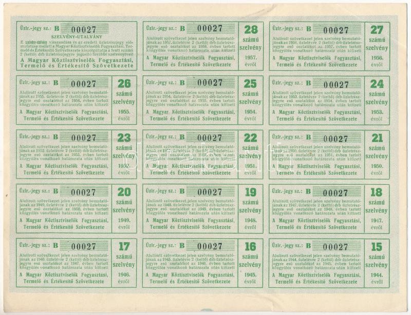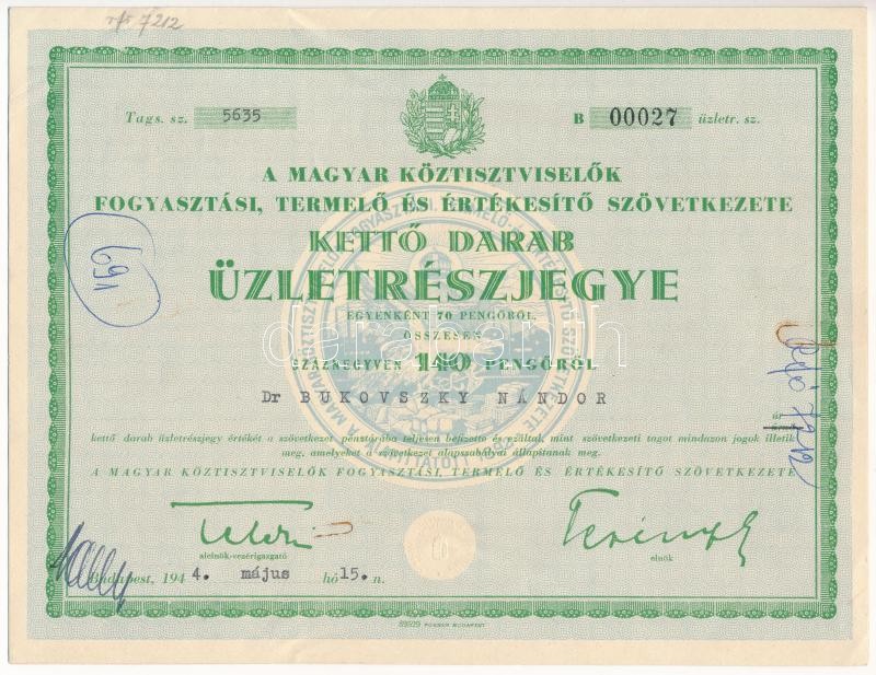 Description: Budapest 1944. "A Magyar Köztisztviselők Fogyasztási, Termelő és Értékesítő Szövetkezete" névre szóló két darab üzletrészjegye egyben, összesen 140P-ről, szelvényekkel, szárazpecséttel T:III
