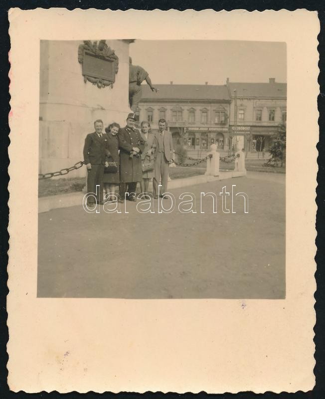 cca 1940 Nyíregyháza, társaság emlékmű előtt, fotó, 7,5×6 cm