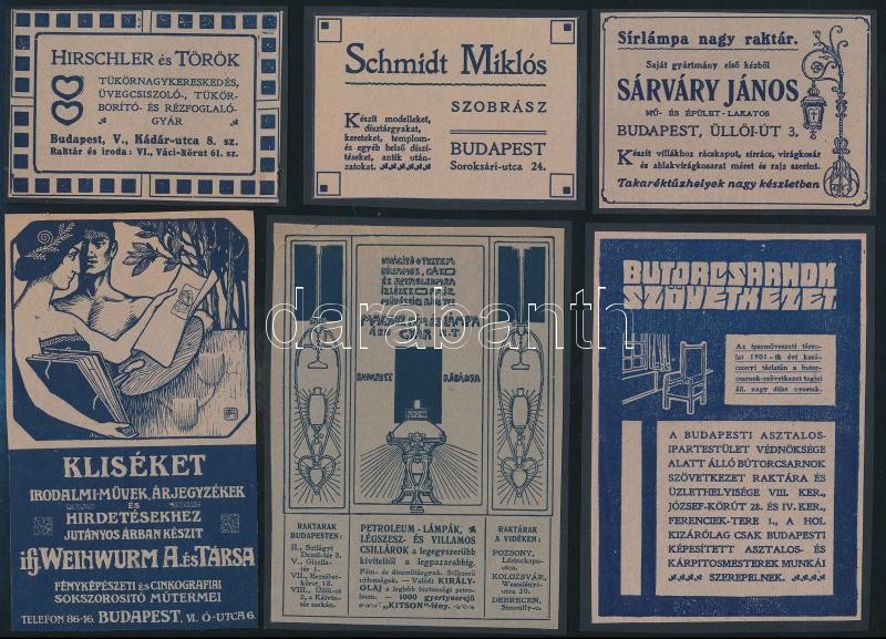 cca 1901 Vegyes reklám tétel, 6 db, Butorcsarnok Szövetkezet, Hirschler és Török Tükörnagykereskedés, Üvegcsiszoló-, Tükör-, Borító- és Rézfoglaló- Gyár, Schmidt Miklós szobrász, Sárváry János mű és épület-lakatos, Weinwurm és Társa Fényképészeti és Cinkográfiai Sokszorosító Műterem, Magyar Fém és Lámpa Áru Gyár Rt., kartonokra kasírozva, 13x9,5 cm és 6x8 cm közötti méretben