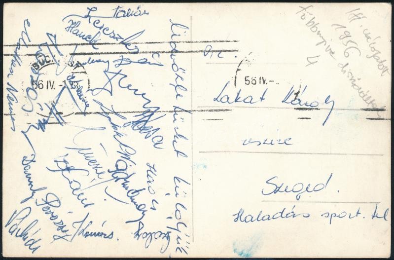 1956 Az ifjúsági válogatott által aláírt és Lakat Károlynak hazaküldött képeslap