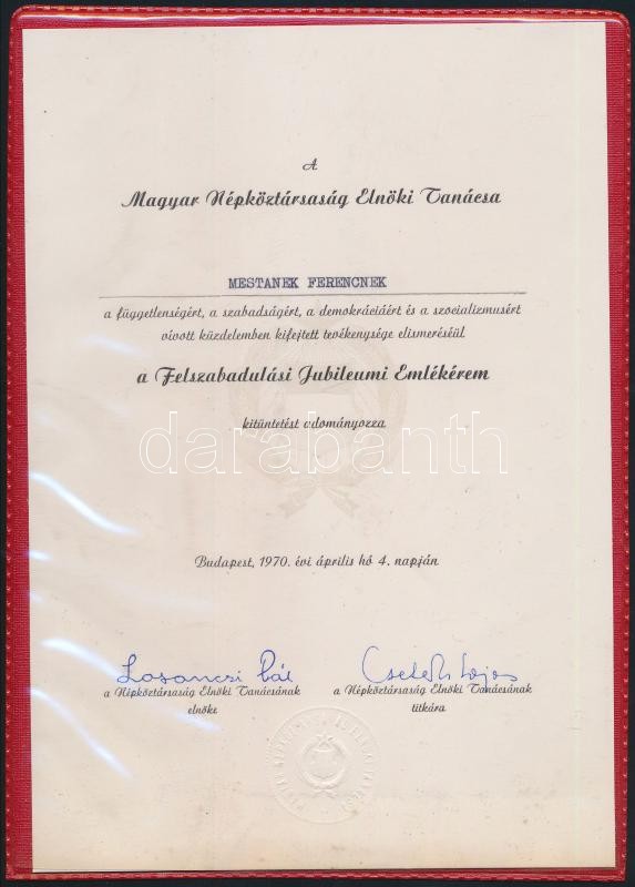 1970 Felszabadulási Jubileumi Emlékérem adományozó oklevél aláírásokka...